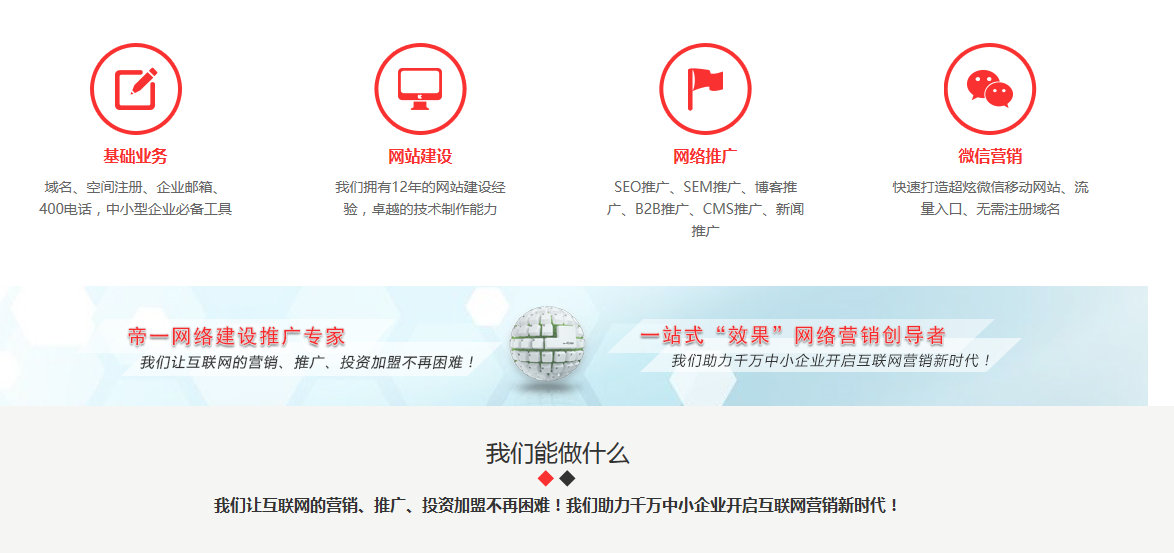 帝壹网络,是一家一站式借力互联网营销运营高科技企业。 长期致力于信息化领域的探索研发和全程服务,帝壹网络业务纵深涉及政府的网站建设和企事业单位的网站建设、网络推广、微信建设营销、应用软件开发以及咨询服务等众多领域。提供互联网全面网络信息咨询与解决方案。