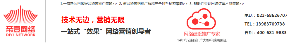 帝壹网络,是一家一站式借力互联网营销运营高科技企业。 长期致力于信息化领域的探索研发和全程服务,帝壹网络业务纵深涉及政府的网站建设和企事业单位的网站建设、网络推广、微信建设营销、应用软件开发以及咨询服务等众多领域。提供互联网全面网络信息咨询与解决方案。