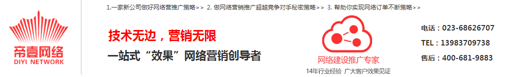帝壹网络,是一家一站式借力互联网营销运营高科技企业。 长期致力于信息化领域的探索研发和全程服务,帝壹网络业务纵深涉及政府的网站建设和企事业单位的网站建设、网络推广、微信建设营销、应用软件开发以及咨询服务等众多领域。提供互联网全面网络信息咨询与解决方案。