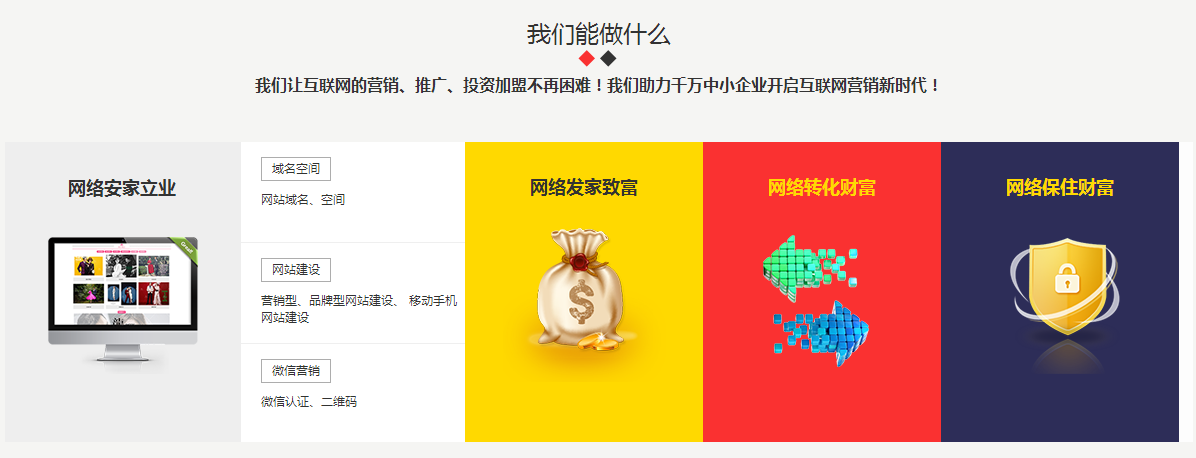 帝壹网络,是一家一站式借力互联网营销运营高科技企业。 长期致力于信息化领域的探索研发和全程服务,帝壹网络业务纵深涉及政府的网站建设和企事业单位的网站建设、网络推广、微信建设营销、应用软件开发以及咨询服务等众多领域。提供互联网全面网络信息咨询与解决方案。