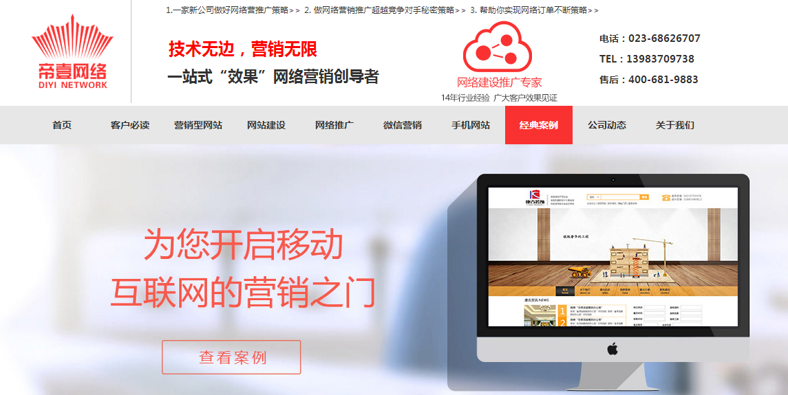 帝壹网络,是一家一站式借力互联网营销运营高科技企业。 长期致力于信息化领域的探索研发和全程服务,帝壹网络业务纵深涉及政府的网站建设和企事业单位的网站建设、网络推广、微信建设营销、应用软件开发以及咨询服务等众多领域。提供互联网全面网络信息咨询与解决方案。